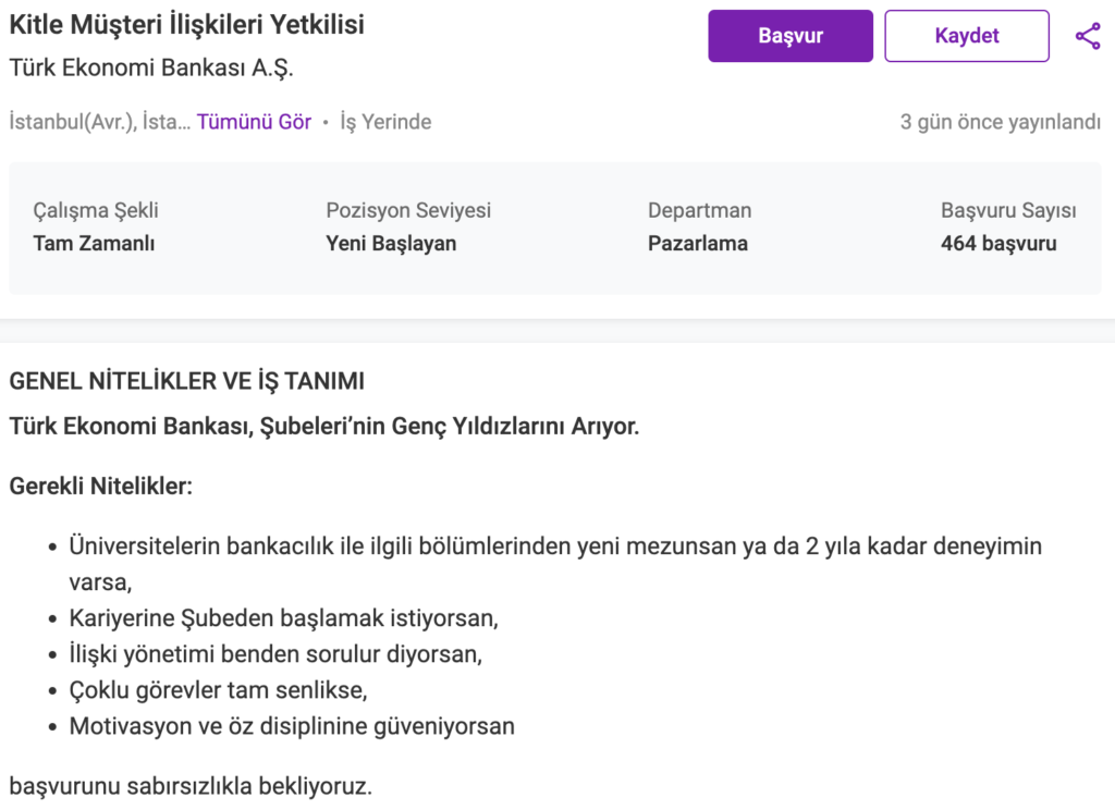 İlan Linki : https://www.kariyer.net/is-ilani/turk-ekonomi-bankasi-a-s-kitle-musteri-iliskileri-yetkilisi-3939500